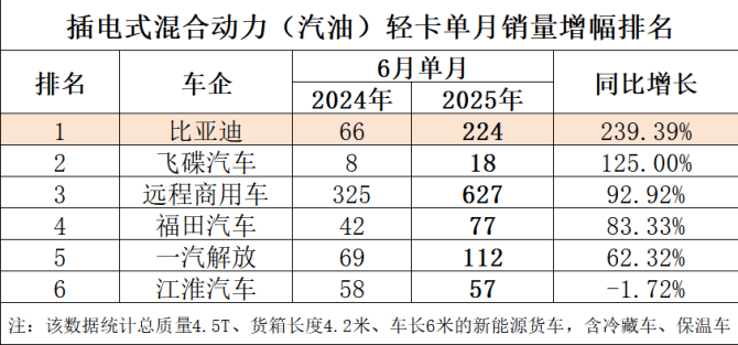 2025年6月新能源轻卡销量14276辆,创半年度新高。根据上险数据和电车资源行业研究院数据分析,在市场利好大势中,比亚迪混动轻卡在插电式混合动力细分市场表现亮眼,同比增长240%,增幅第一;单月销量224辆,位列第二。数据来源:上险数据技术优势凸显,奠定增长