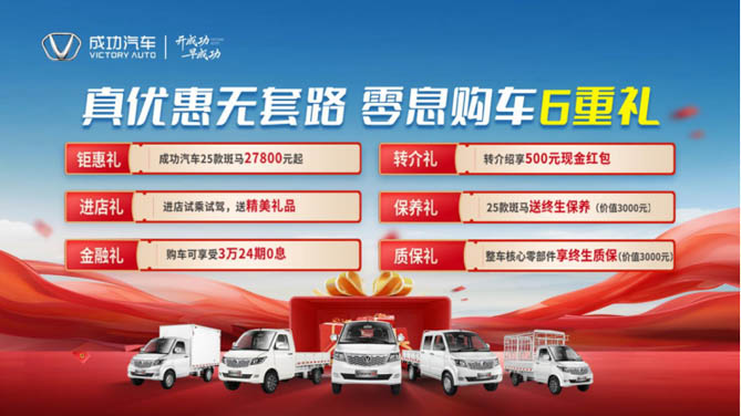 2025年5月1日,在五一劳动节来临之际,成功汽车正式推出“斑马创富计划”,以“致敬车轮上的奋斗者”为主题,面向全国商用车用户推出全系25款斑马车型限时钜惠政策,并创新打造“购车-用车-养车”全生命周期服务保障体系,以真金白银降低创富门槛,赋能货运从业者高效运