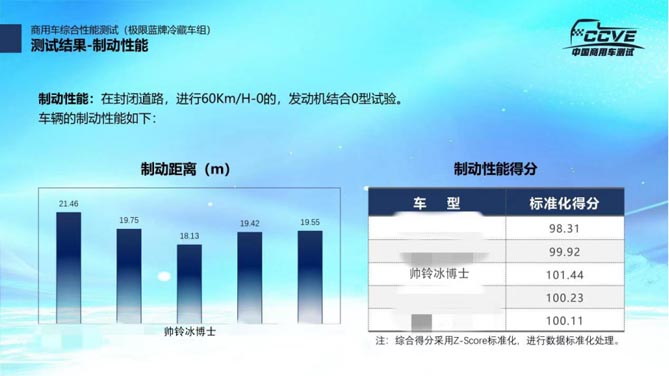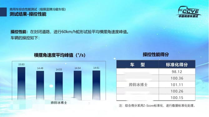 此次“5A级冷藏车”认证包含了对车辆的动力性能、制动性能、经济性能、驾乘舒适和温度控制共5项一级指标以及细分的9项二级指标在内的详细评价。测试中,冷链1号·帅铃冰博士冷藏车在60km/h刹停项目中以18.13米的优异成绩在五款主流F类冷藏车中名列前茅,制动性能行业第一;在60km/h蛇形试验中,帅铃冰博士冷藏车平均横摆角速度峰值最佳,以101.11的高分稳居第一。