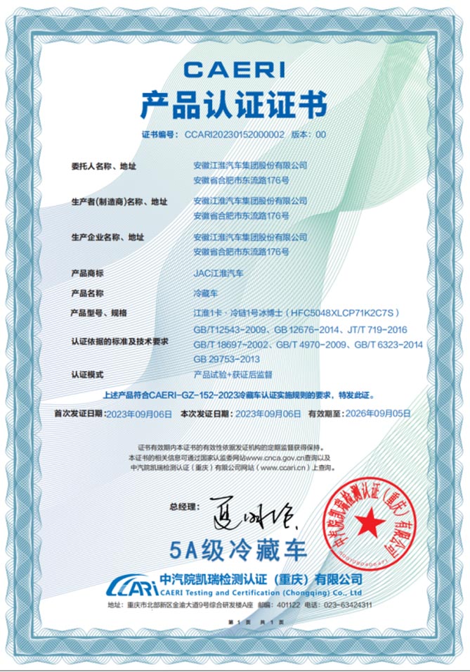 实力!江淮1卡冷链1号·帅铃冰博士获“5A级冷藏车”权威认证