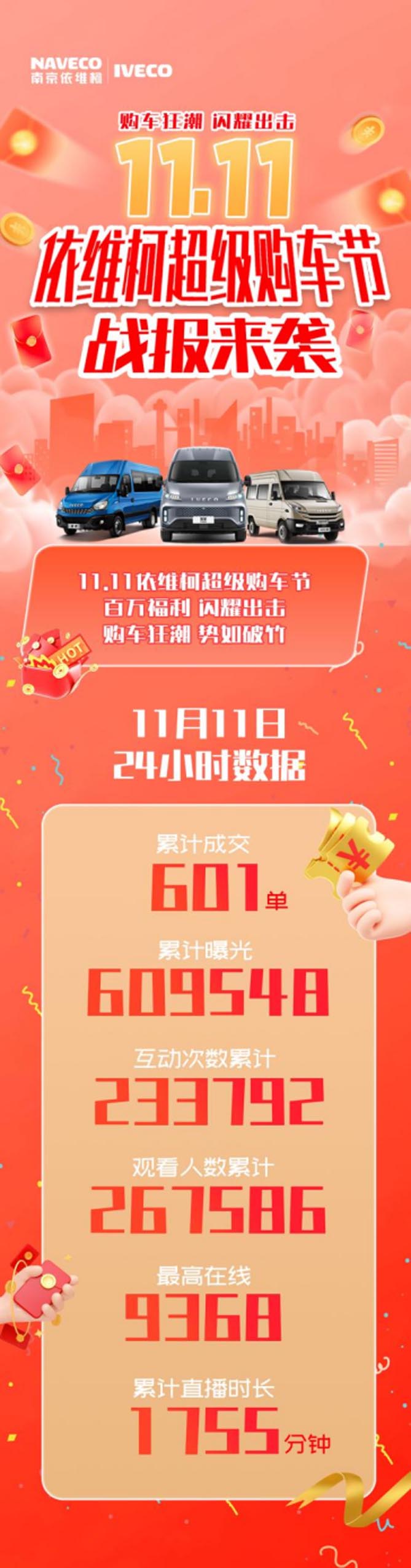 11月11日当天,直播间福利“狠”超值。南京依维柯联动旗下聚星全系车型、全新得意全系车型、欧胜指定车型,于抖音、视频号、天猫平台开展直播活动。直播期间,各平台直播间限时发放大额优惠券、秒杀券等多重福利,掀起一波互动狂潮,收获了一众粉丝,并售出了亮眼的成绩。