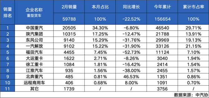 2024年2月,受春节期间终端需求下降影响,国内重卡市场销量遭遇“断崖式”下跌,行业整体销量仅5.98万辆,环比下降38%,同比下降23%,出现环比、同比双降的局面。然而强者恒强,中国重汽凭借超凡产品实力逆势而上,2月实现销量2.05万辆,市占率34.30%,持续霸榜重卡行业销量、市占率“双冠军”!