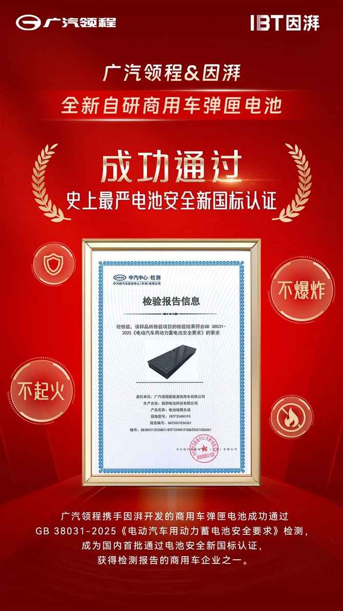工业和信息化部于3月发布GB38031-2025《电动汽车用动力蓄电池安全要求》(以下简称“新国标”),将于2026年7月1日正式实施。该标准首次将“不起火、不爆炸”列为强制性要求,并新增底部撞击、快充循环后安全测试等内容,被业界称为“史上最严电池安全令”。广汽领程全自研商用车版弹匣电池,已成功通过新国标认证!此次认证不仅彰显广汽领程的前瞻技术布局,更为新能源商用车安全性能树立全新基准。