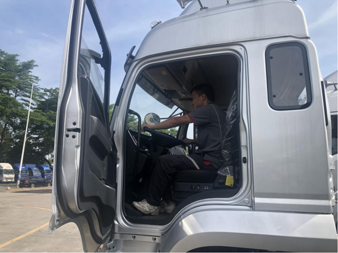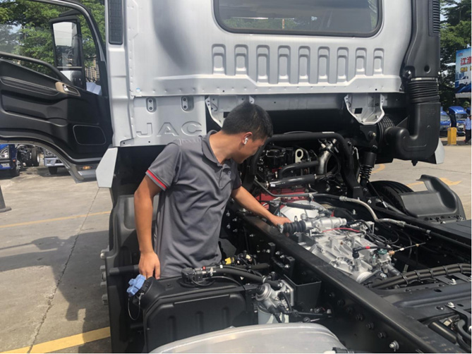 工厂货物运输需求量大,货物较重,因此必须使用中卡,胡老板经验丰富,选车的时候“直奔主题”,直接就看发动机和变速箱。他说:“卡车最重要的就是底盘、发动机和变速箱。变速箱一般是法士特的多一些,带同步器的换挡会比较顺畅。发动机肯定就选康明斯的了,这车(德沃斯)用的是安徽康明斯发动机,不错。底盘那就更不用看了,这不是江淮的强项嘛。”在东莞一带,江淮1卡的市占率比较高,胡老板说:“东莞路上跑的货车很多是江淮。”