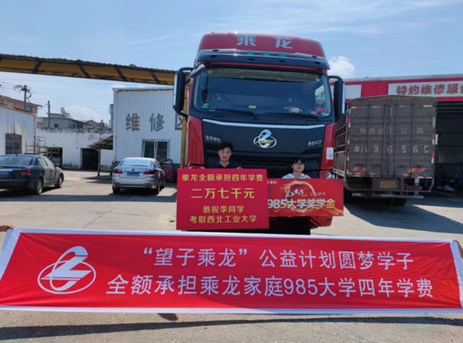 2022年,乘龙在67品牌客户日上推出了“望子乘龙”第二季公益计划,考上并入读985高校的乘龙卡友子女;东风柳汽全额承担大学本科期间学费,参加高考或中考,并被大学或高中录取的乘龙卡与子女,获得奖学金支持;为全国100个重卡村小学,捐赠一批文教体育器材,让孩子们在学习之余尽情享受童年乐趣。
