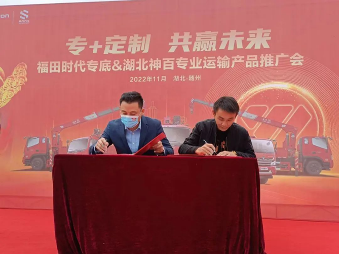 近日,福田时代专底携手湖北神百集团,于炎帝神农故里、编钟古乐之乡湖北随州召开“专+定制 共赢未来”福田时代专底&湖北神百专业运输产品联合推广会。福田时代专底营销公司随州中心总监孙海滨、湖北神百集团董事长白贵涛、湖北神百集团福田时代业务经理刘金奎以及众多专用车领域的销售精英们参与本次活动。活动现场签约随车吊底盘300台,双方强强联合,实现共创共赢。