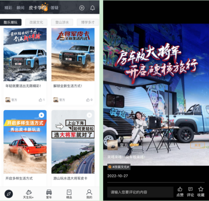 除五大核心板块外,皮卡生活APP倾力打造的“皮卡学院”为广大皮卡爱好者专业赋能,通过酷乐潮玩、改装文化、登山涉水、博学多才等细分内容,为皮卡车主提供更多关于皮卡车生活的美好创想,通过更专业的内容展示,用车、改装分享,解锁更多越野、户外体验等,让用户的皮卡生活打开全新世界。