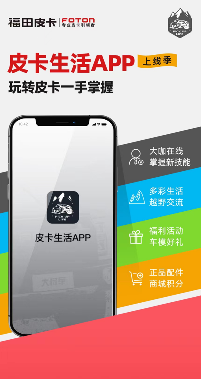 想遇见志趣相投的皮卡高端玩家?想和万千皮卡车友分享生活百态?想连动线上线下,玩转多元皮卡生活?还等什么,快来皮卡生活APP,在这里开启丰富多彩的皮卡车生活吧!福田皮卡倾心打造的皮卡生活APP已正式上线,社交分享、官方资讯、用车服务、远程操控、会员积分等功能一应俱全,扫描下方图片二维码,下载APP全天候享受皮卡生活乐趣,开启属于你的皮卡生活。