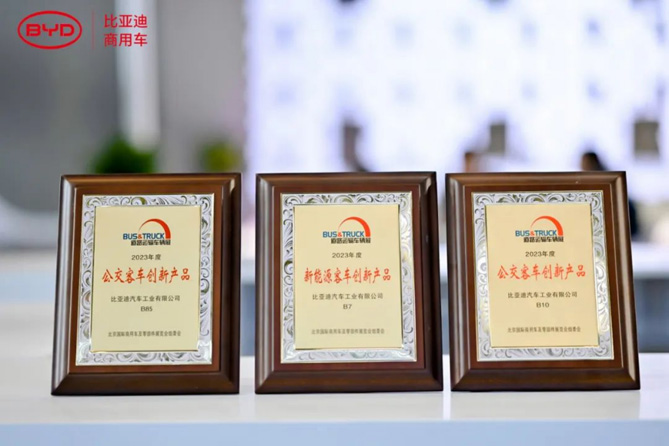 同期,“2023年道路运输展创新产品”推选活动如期举行。纯电动公交车B7、纯电动公交车B85/B10揽获“新能源客车创新产品”“公交客车创新产品”三项大奖,体现了行业对比亚迪及客车全新产品的认可和领先新能源科技的肯定。