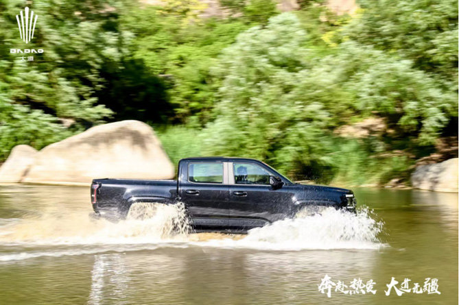 试驾行进过程中,涉水路面、山路陡峭,陡坡、碎石、炮弹坑、交叉轴等路况直接将驾驶难度拉满,这是对驾驶技术,和整车底盘韧性、越野能力的巨大考验。但通过透明底盘功能可以让人轻松掌握路面和水下状况,为驾驶者带来充足的前进信心,800mm的超高涉水深度可以应对大部分的轻涉水行进,给足征服前路的底气。在大道皮卡的保驾护航下,全程驾驶没有丝毫压力,拥有强悍性能下的征服乐趣。