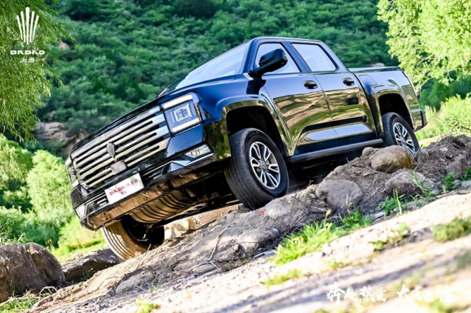 当行进到土路上的壕沟、炮弹坑路况时,大道皮卡的硬派越野本领就派上了用场,极限路况对它的通过性几乎形不成任何挑战。大道皮卡拥有220mm同级最优悬挂行程,接近角和离去角分别达到30°和26°,天然拥有良好的通过性,四驱系统的加持可以轻松应对交叉轴等极端路况,通过对动力的有效分配,提升极端路况的脱困能力,可谓驭见崎岖,皆为坦途,整个山区路段的驾驶整体感觉并不费力。