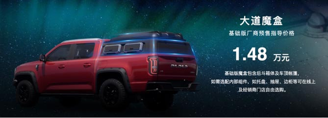 大道魔盒也开启预售并在10月起陆续交付,敢探者、大道·飞将、追光者,均可选配。魔盒基础版厂家预售指导价格为:1.48万元(包含后斗箱体及车顶帐篷,如需选配内部组件,如托盘、抽屉、边柜等可在线上及经销商门店自由选购)。