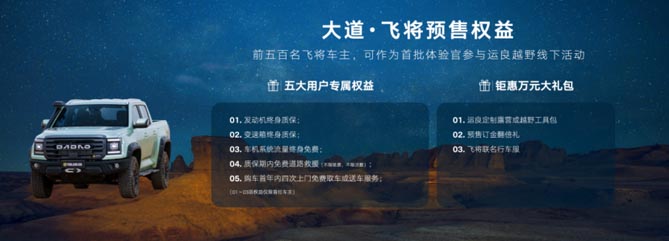 大道·飞将同步开启预售,配备柴汽油 AT 四驱,四款车型,厂商预售指导价格分别为: 飞将汽油无界版 19.98 万元,飞将汽油极境版 21.88 万元;飞将柴油无界版 20.38 万元,飞将柴油 极境版 22.28 万元。