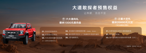特别注意的是,17.28万汽油无界版性价比十足,入门即满配,在17万左右的价格区间,2.3T汽/柴油发动机,峰值功扭190千瓦/450牛米(汽油版),130千瓦/450牛米(柴油版)、底盘承载力达3.2T、后拖挂拖拽能力3T、540°高清全景影像+透明底盘、900mm涉水深度、蠕行掉头、越野信息显示、全地形管理模式、红色卡钳,这些配置全部都有,在皮卡圈几乎没有对手,敢探者这次诚意相当足!同时,大道敢探者还带来了六大意向礼、三重大定礼等多项预售权益,为用户体验再次加码。感兴趣的朋友可以在江铃官网、微信同道中人小程序及同道中人APP上选购。