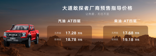 在发布会上,大道敢探者正式公布了厂商预售指导价格:配备柴汽油 AT 四驱,共四款车型,厂商预售指导价格分别为:敢探者汽油无界版 17.28 万元, 敢探者汽油极境版 18.78 万元;敢探者柴油无界版 17.68 万元,敢探者柴油极境版 19.18 万元。
