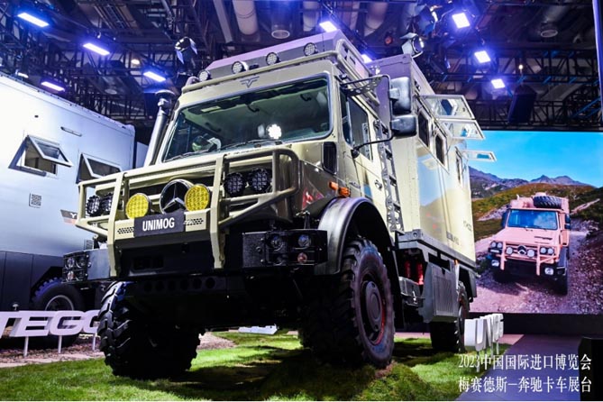 本次参展的Unimog U 4023越野旅居车为新产品首次在华亮相,和四川艾可沛合作开发。颇具传奇色彩的Unimog车型诞生于1946年,在设计上极为与众不同,具有出类拔萃的通过性及涉水深度;还可应用于多种行业,如越野旅居、灾害救援、机场除雪等。