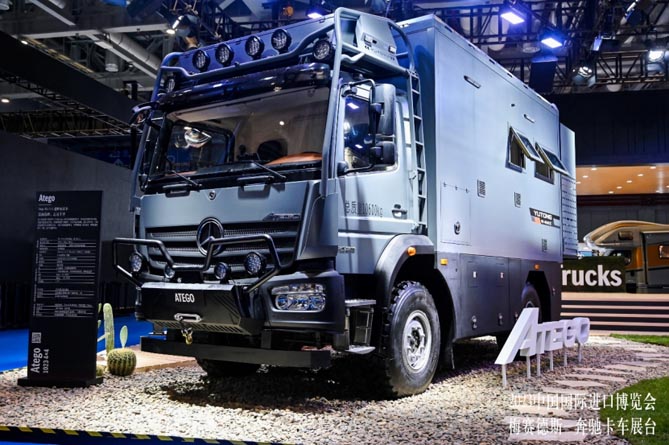 继第五届进博会上首展梅赛德斯-奔驰Arocs 4x4越野旅居车并大获成功后,梅赛德斯-奔驰卡车在今年引入更丰富的旅居车产品组合。此次展出的Atego越野旅居车和宇通专用车合作,基于中型卡车Atego 1023 4×4改装,C照可开,容易驾驭,更适合舒适型长途越野旅居。这也是在我国旅居车销量创历史新高的背景下,梅赛德斯-奔驰卡车对中国客户需求的积极回应。