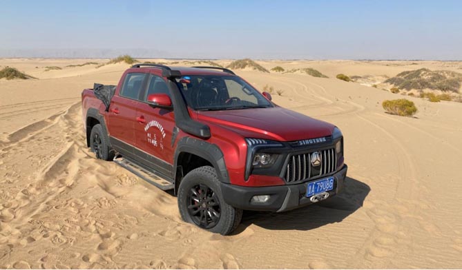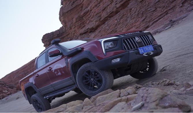 要想顺利通过沙漠,拥有强劲动力和四驱系统还不够,车辆的底盘也很重要。中国重汽皮卡采用前双叉臂独立悬架,后多连杆整体桥悬架,让车辆在沙漠中高速行驶时更加平稳,各种左右摇摆跳跃,依然能应付自如。车身离地间隙230mm,接近角32°,离去角26°,通过性优越,连绵起伏的沙丘和沙山也能顺利翻越。沙漠中的冒险行程,验证了中国重汽皮卡的出色的动力性能、四驱能力和通过性。