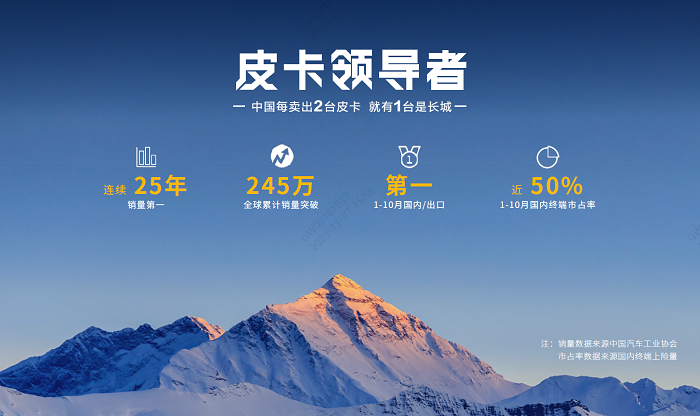 作为皮卡领导者,长城皮卡已连续25年销量第一、全球累计销量突破245万。1-10月国内终端市占率近50%,中国每卖出两台皮卡,就有一台是长城。长城炮品牌四周年,更成为首个突破50万台的中国高端皮卡品牌,创造新的长城炮速度,引领中国皮卡持续向上。长城炮持续深化全球化布局,已在全球四大洲50余国上市,更成为澳洲ANCAP新标准下五星安全评级的中国品牌。