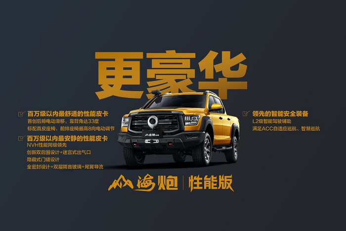 越野炮作为中国首款全地形量产越野大皮卡,广受越野玩家信赖,稳居中国越野皮卡单车型销量榜首。23款越野炮定位“全球智能豪华越野皮卡”,冠军实力再进阶,以“越野型、越野心、越野趣”三大硬核实力,成为越野爱好者的专业伙伴。
