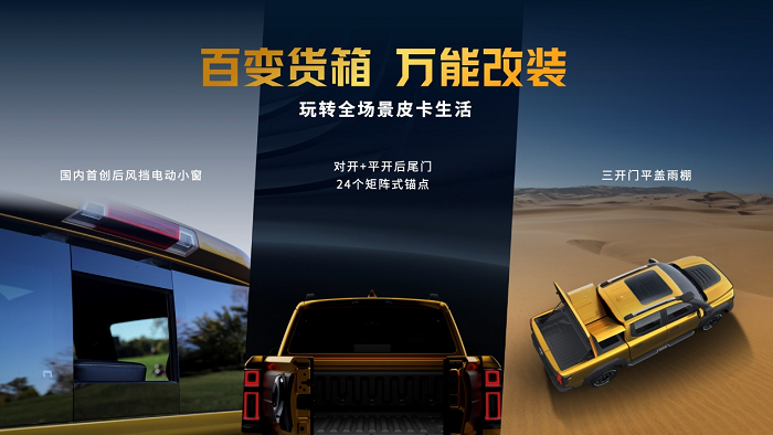更好玩,解锁无限生活可能。山海炮性能版国内首创6:4对开+平开后尾门、后风挡电动小窗等人性化设计,首创三开门平盖雨棚,出厂自带C6拖挂牵引资质,满足3.3吨拖车认证,中国皮卡拖挂最强,玩转全场景皮卡车生活。
