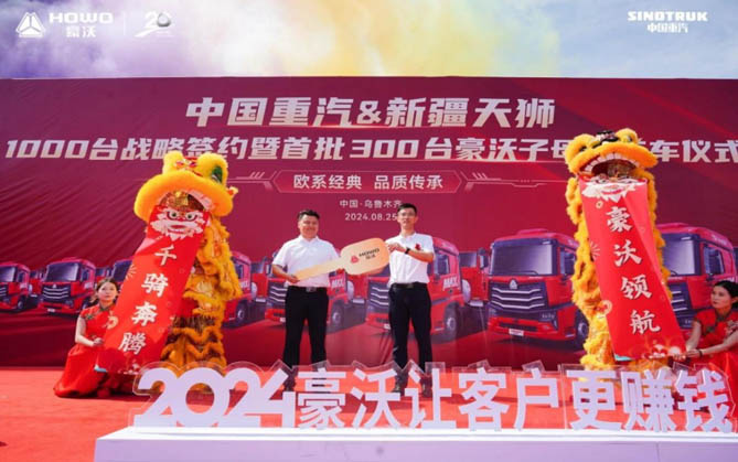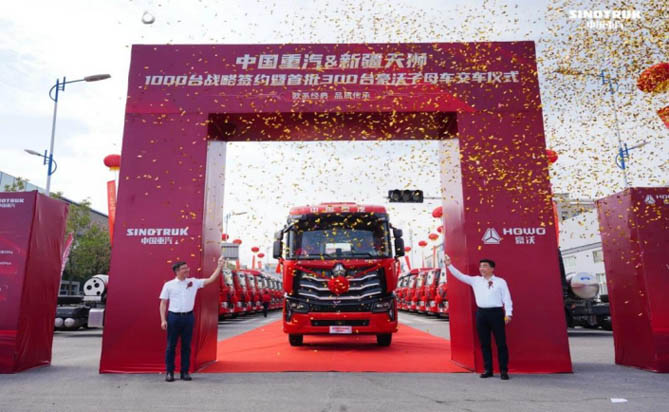 在辽阔壮丽的新疆乌鲁木齐,一场意义非凡的交车庆典璀璨启幕,标志着中国重汽豪沃重卡与新疆天狮供应链管理有限公司合作的新篇章正式开启。庆典现场,300辆豪沃子母车荣耀交付成为焦点,双方共同见证了1000辆战略合作签约的历史性时刻。这批专为煤炭运输量身定制的燃气重卡,以其卓越的性能和高效的运输能力,将成为煤炭运输领域的强劲力量,助力新疆能源产业再攀高峰。