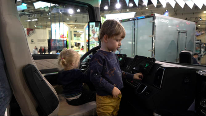 在这场商用车前沿技术的展会现场,家庭日的出现让科技与未来同频,商业与人文共振。而中国重汽展台的每一台车,每个细节都透露着其对商用车历史的尊重与对未来的展望。