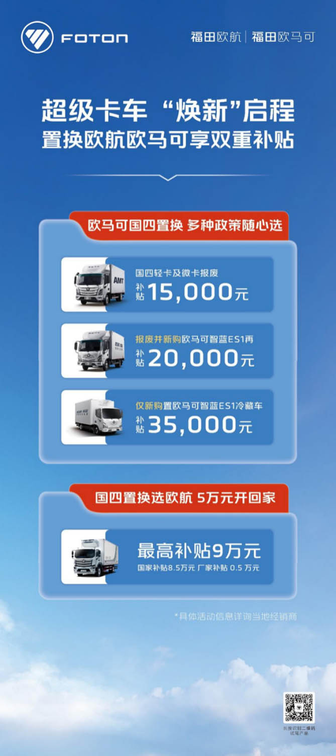 在新能源大行其道的当下,普遍高于同等级别的燃油轻卡的购车成本依旧是不少用户置换纯电轻卡的最大阻碍。为进一步降低用户成本负担,在政策窗口期,欧航欧马可在国家补贴之上,针对性推出补贴政策,大幅降低用户“焕新”成本,以卓越的产品性能表现助力用户降本增效。