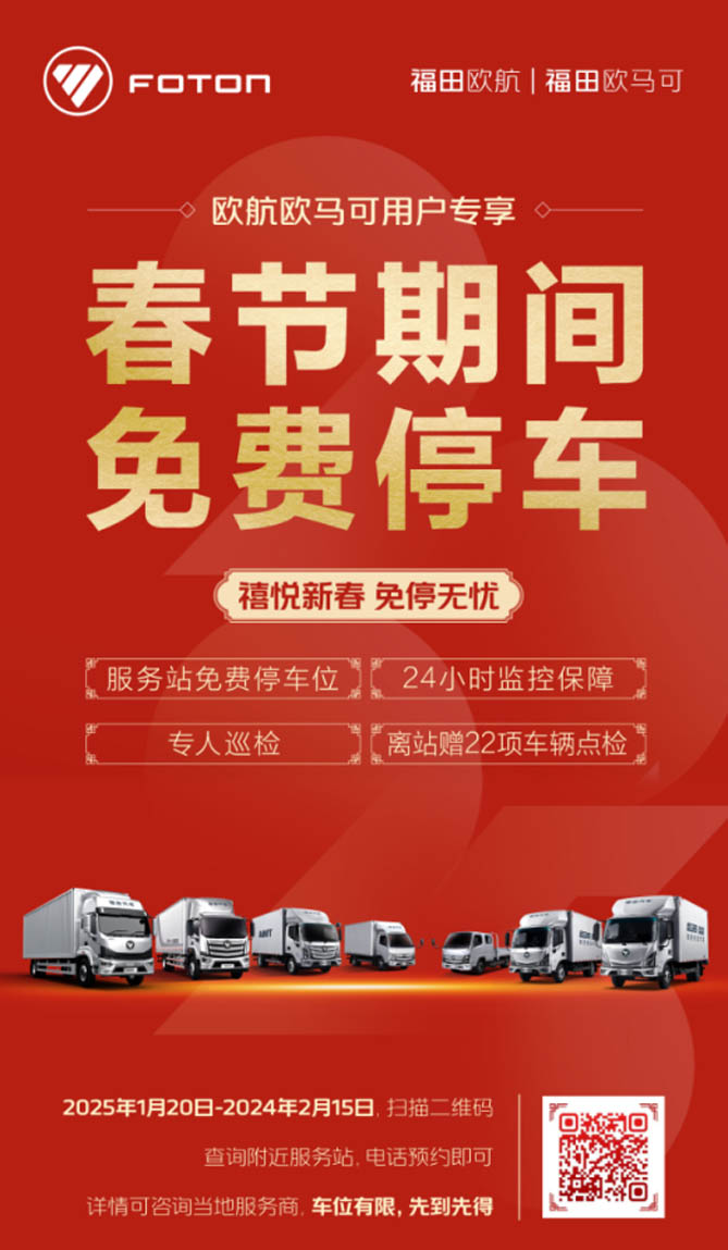 每逢春节长假,“停车难、停车贵、安全停车”成为卡友绕不开的话题。为缓解这一难题,欧航欧马可联合全国各大服务站推出“禧悦新春 免停无忧”活动,让卡友不受停车困扰,安心过大年。