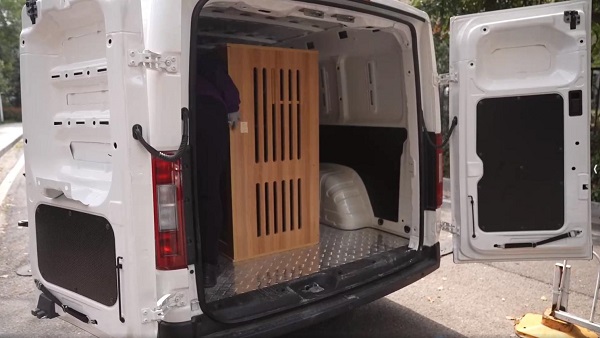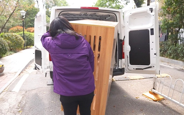 第二单货有点“奇葩”,是个养猫用的小木屋,也称“猫别墅”(城区工况)。这物件重量不大但是体积较大,高度达到一米二。前面开小面的师傅都因为装不下把订单取消了,货主有心忍痛叫个4米2的厢货,但又觉得不值。得益于一体化承载车身的低地板设计,乐福的货舱内部净高度达到了一米四五,而离地间隙并没有受到影响,侯女生轻松接下了这单。