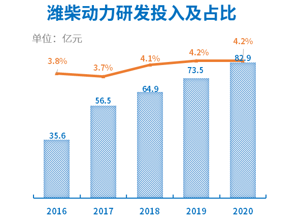 从潍柴动力历年报表可以算出,过去5年累计研发投入超过300亿元,2020年研发投入占比达到4.2%,是装备制造业中最高的企业之一。