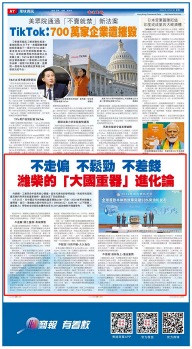 4月20日,在中国近代内燃机的重要肇始之地—天津,2024世界内燃机大会开幕。当日,潍柴动力研发的全球首款本体热效率53.09%柴油机对外隆重发布。