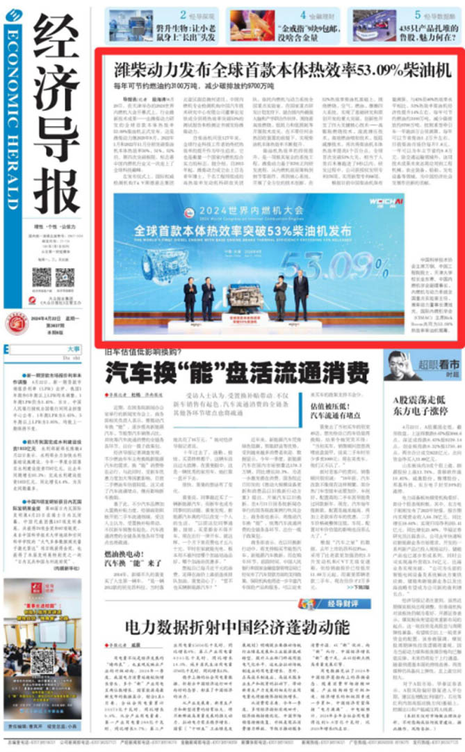 导报讯(记者 段海涛)4月20日,在天津举办的2024世界内燃机大会开幕式上,行业最新技术成果——由潍柴动力研发的全球首款本体热效率53.09%柴油机正式发布。这是潍柴动力继2020年9月、2022年1月和2022年11月分别突破柴油机本体热效率50%、51%、52%后,第四次突破极限,标志着中国内燃机行业又一次走上了全球科技巅峰。