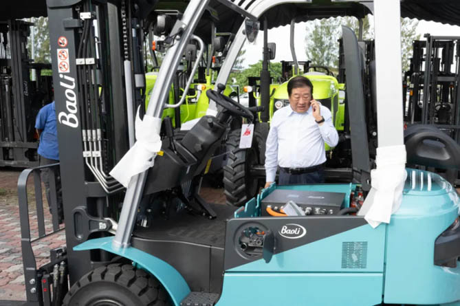 谭旭光现场调度德国凯傲旗下宝骊电动叉车电池配置情况。