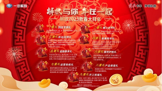 一汽解放陪伴各位卡友走过了极不平凡的2022年,为感谢广大卡友长期对一汽解放的支持与关注,在直播间解放为广大卡友准备了非常多的惊喜福利。解放与你,年在一起,一汽解放将用满腔热忱和诚意陪伴卡友们共渡凛冬,喜迎新春,共庆新年。