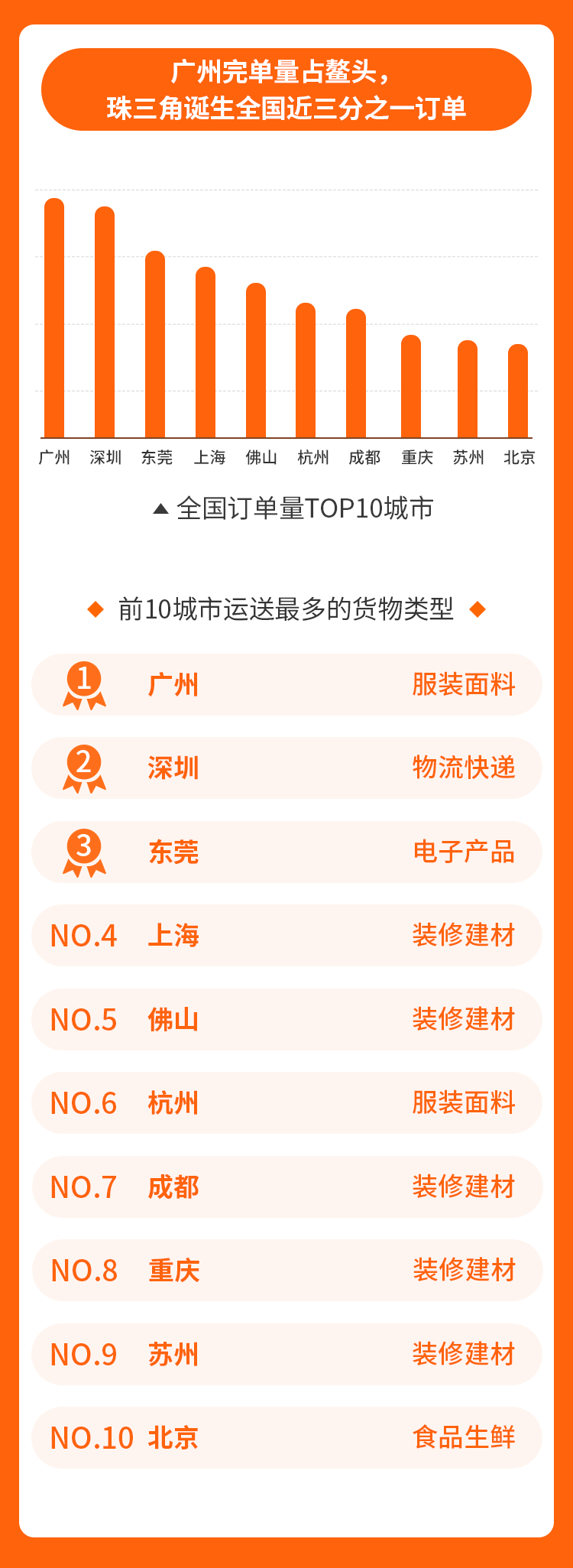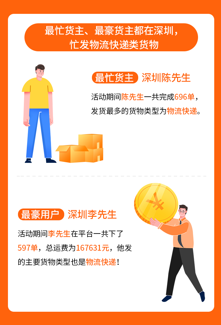 本次最忙货主和最豪用户都诞生在深圳。深圳陈先生在活动期间一共完成696笔订单,为本次拉货节完单最多的用户;深圳李先生在平台下了597单,总运费为167631元,为完单金额最高的用户。两位用户的主要货物类型都是物流快递!