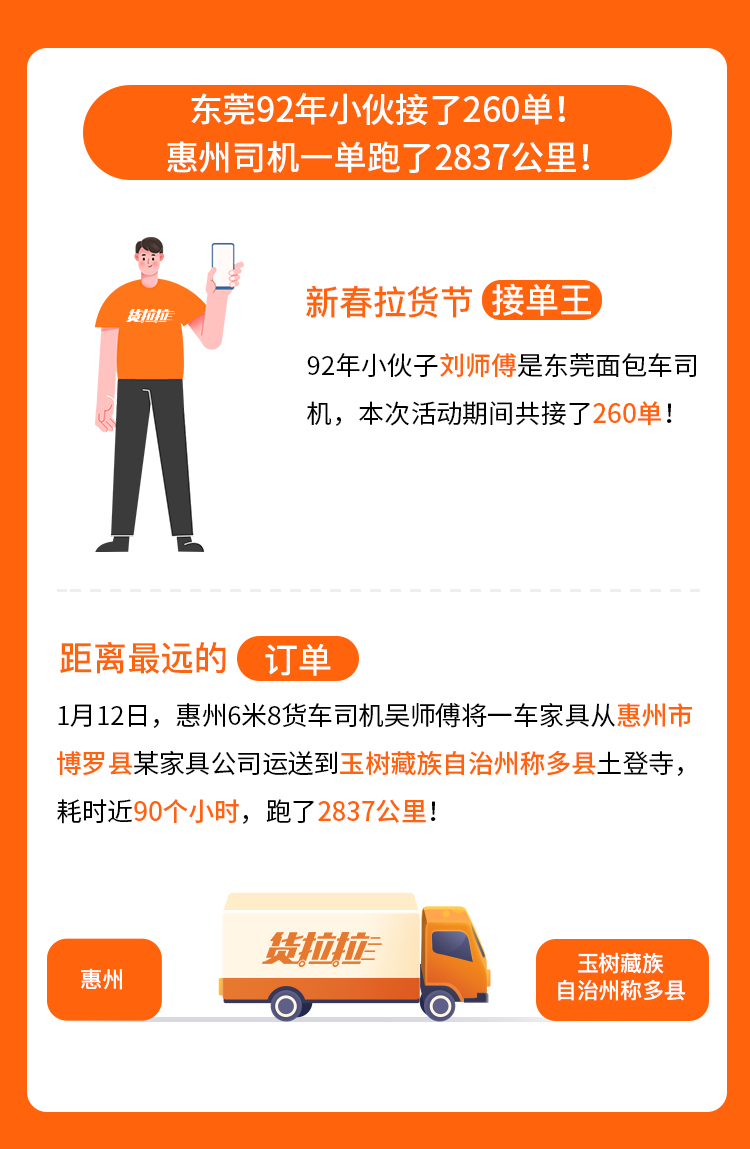 此次新春拉货节涌现出一批很“拼”的司机和用户。92年小伙子张师傅是东莞面包车司机,在这次活动期间共接了260 单!是本次拉货节当之无愧的接单王。1月12日,惠州6米8货车司机吴师傅将一车家具从惠州市博罗县某家具公司运送到玉树藏族自治州称多县土登寺,耗时近90个小时,跑了2837公里!这是平台距离最远的一单!