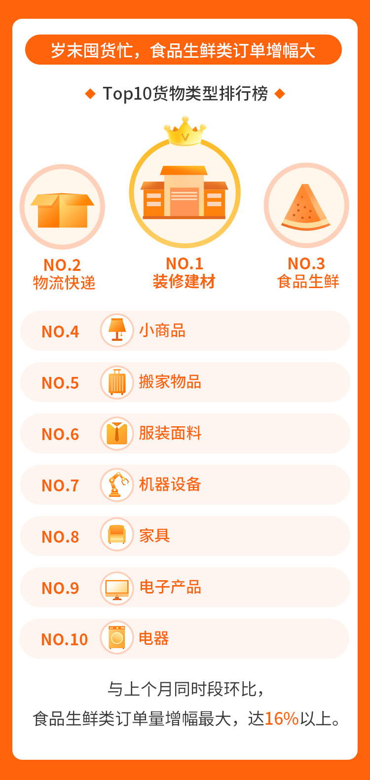 临近岁末,很多用户都忙着买买买,囤年货,也有不少用户忙着装新家换新颜。在活动期间的TOP10货物类型中,装修建材、物流快递、食品生鲜、小商品等订单遥遥领先。与上个月同时段环比,食品生鲜、物流快递、家具、小商品、花卉类单量增势明显,其中食品生鲜增幅最大,达16%以上。在近期受到新冠疫情影响较严重的河北,其他货物订单明显陡降,唯有食品生鲜类订单依然保持正增长。