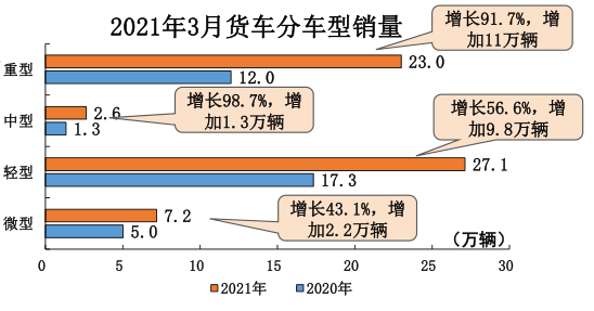 数据显示,3月我国汽车市场产销两旺,分别达到246.2万辆和252.6万辆,同比增长71.6%和74.9%。同时,1-3月,汽车产销635.2万辆和648.4万辆,同比增长81.7%和75.6%。这其中,商用车3月产销57.9万辆和65.1万辆,再创历史新高,中重卡、重卡、轻卡同比增长幅度大,皮卡最为亮眼。