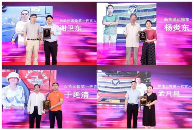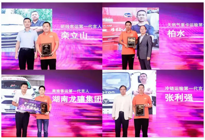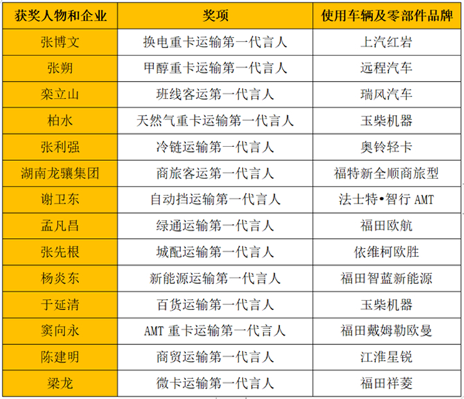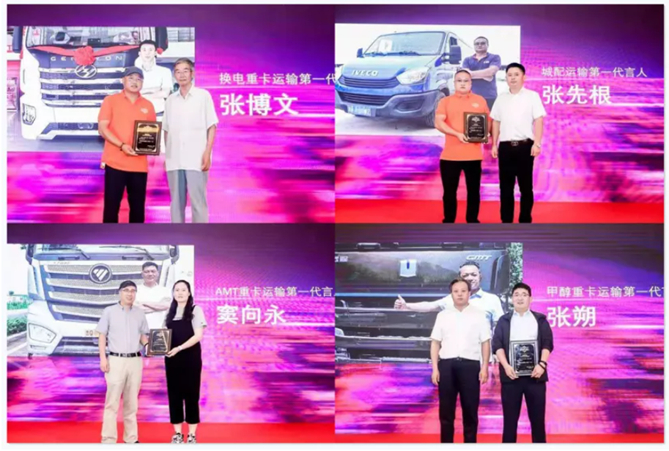 这14位“第一代言人”分别是:“换电重卡运输第一代言人”张博文、“甲醇重卡运输第一代言人”张朔、“班线客运第一代言人”栾立山、“天然气重卡运输第一代言人”柏水、“冷链运输第一代言人”张利强、“商旅客运第一代言人”湖南龙骧集团、“自动挡运输第一代言人”谢卫东、“绿通运输第一代言人”孟凡昌、“城配运输第一代言人”张先根、“新能源运输第一代言人”杨炎东、“百货运输第一代言人”于延清、“AMT重卡运输第一代言人”窦向永、“商贸运输第一代言人”陈建明,以及“微卡运输第一代言人”梁龙。