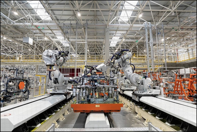 中国重汽“智能网联(新能源)重卡项目”重卡生产线实现了全自动化生产,更有诸多首创技术,车架全自动纵梁加工生产线和焊装生产线全自动化率达到100%;冲压生产线在国内商用车首次采用伺服压机+数控液压垫;总装生产线采用行业首创的无线非接触式供电技术。