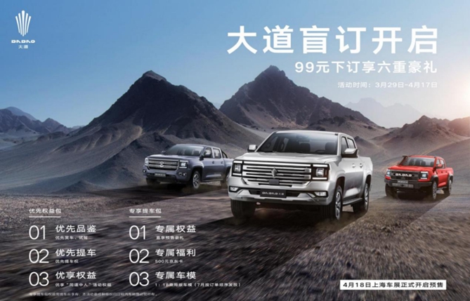 作为大道品牌旗下首个产品系列,本次亮相的三款新车不仅可以满足用户全场景的用车需求,在越野配置、外观内饰,智能科技等方面也都极具诚意,全面出色的表现力将重塑皮卡市场格局。据悉,新车将于4月份上海车展期间正式开启预售。