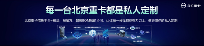依托“根魔方”技术,北京重卡通过12大类、数百项内容的定制,围绕根车型全配置开发,30+根车型可配置出190+个销售车型,加上用户的个性化配置选择,可实现超20000+种产品配置的自由组合,覆盖95%的市场。