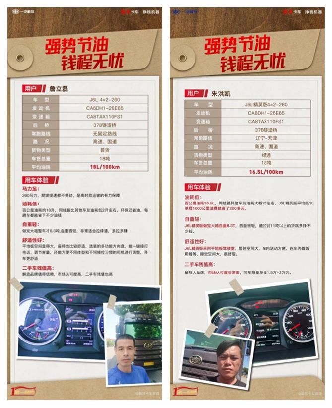 卡车司机朱洪凯师傅,经常往返于辽宁-天津路段,他说跑长途拉绿通,省油、多挣钱是关键,这也是他选择解放J6L精英版最重要的原因之一。他说:“我这车百公里油耗只有16.5L,相对同线路其他车友平均低3L,单程1000公里油费就省了200多块钱。还有,J6L精英版做完大箱自重6.3吨,车辆自重轻,能拉到11吨以上的货就多挣不少钱。另外,解放是大品牌,解放车市场认可度也特别高,同年限的二手车相比其他品牌能多卖1.5万-2万元,真的是又会赚又能省,特别合适。”