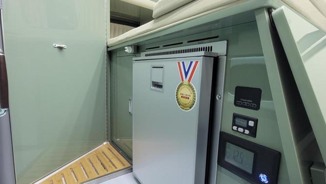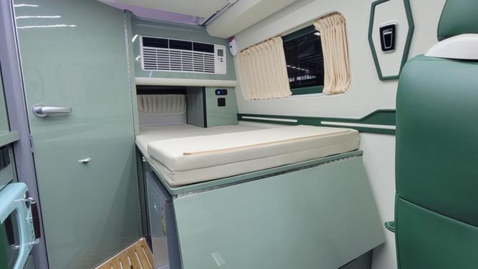 在不升顶的情况下,下方的一张纵置床也可以满足单人的睡眠,通过座椅的前移可延展达到1850mm*850mm;床尾上方安装了KME的房车变频空调,床下位置装有房车专用冰箱,床板下多余的空间就是整车的一个独立储物区域。