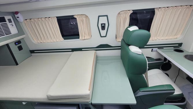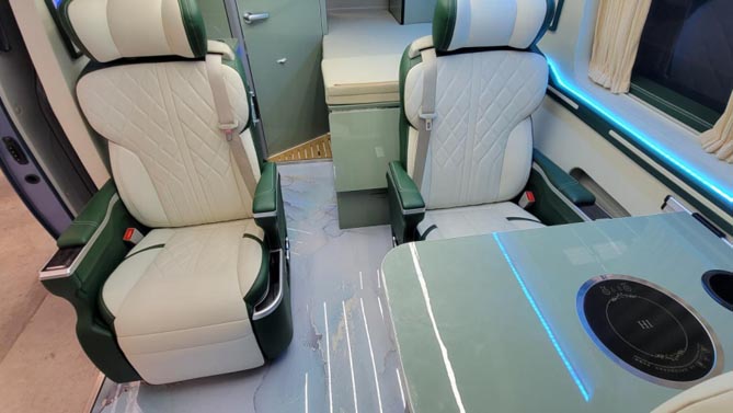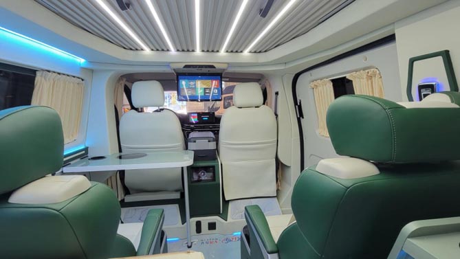 齐星星领的商务座椅可实现四向调节,带有按摩、加热、通风功能,长途旅行舒适性更高,可拆卸式的小桌台上面置有800W的电磁炉,日常车内可进行轻油烟的简餐烹饪。