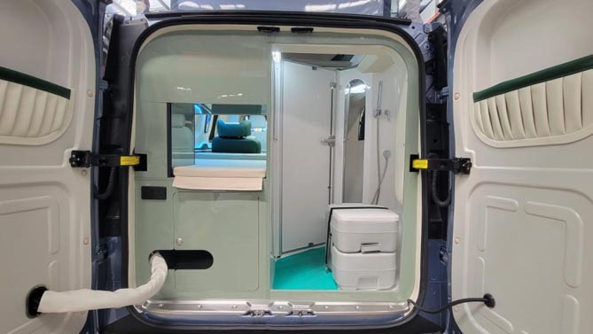 紧挨纵置床的一侧是固定式卫浴间,采用后开阔式设计,具备多功能使用,配备便携式移动马桶、淋浴花洒,整体可实现旅行应急如厕、洗漱,也可作一个单独的储物空间。