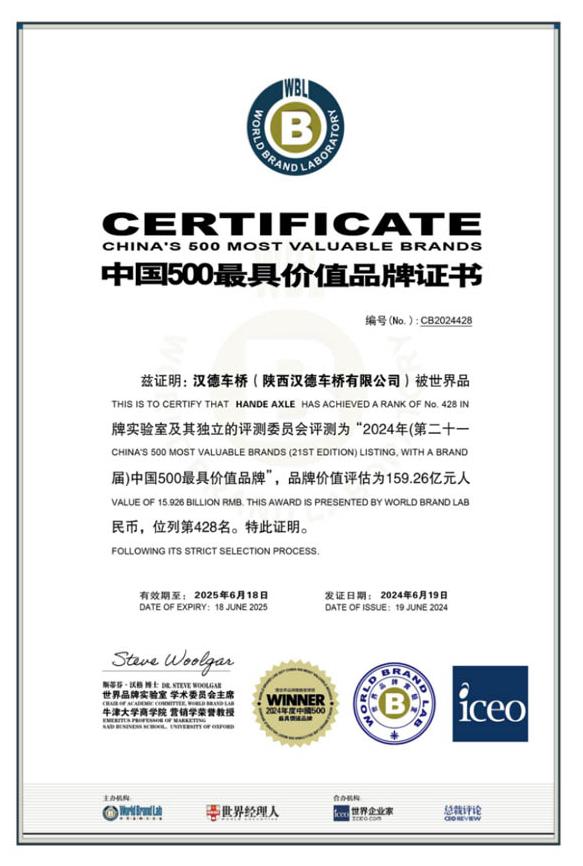 6月19日,由世界品牌实验室(World Brand Lab)主办的第二十一届世界品牌大会在北京举行。会上发布了2024年《中国500最具价值品牌》分析报告,汉德车桥入围榜单,品牌价值评估159.26亿元人民币,位列第428位。