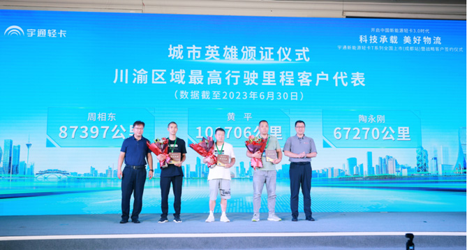 身为行业领导者,宇通轻卡始终致力于推动行业的向前发展。为让更多卡友了解到纯电轻卡的真实续航表现,也为帮助用户寻找更优的驾驶技巧,宇通轻卡自今年年初便发起了“驭极限 我定义”极限挑战赛。经过一段时间的运营,在西南区域已经出现了很多成绩优异的卡友,而宇通轻卡也把他们请到了现场,请他们上台分享自己对宇通轻卡真实的运营感受同时,也在中汽兄弟的见证下,为卡友颁发“城市英雄”奖章。