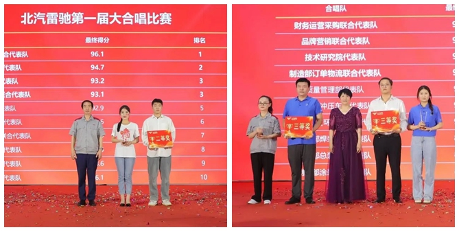 北汽雷驰联合创始人、董事长张剑在致辞中表示,“围绕国家双碳战略部署,商用车新能源化是大势所趋,山东省更是走在了新能源汽车推广的前列,北汽雷驰占尽天时、地利、人和,成为中国城市新能源物流车领跑者是北汽雷驰唯一的目标,也是必然的归途。唯有践行井冈山精神,才能从一个胜利走向另一个胜利。” 在阵阵掌声和欢呼中,2023届新入职的大学生带来开场舞《相亲相爱》,浓郁的青春气息扑面而来,倍感振奋。 伴随着激昂的音乐,周年庆典合唱比赛正式拉开序幕,来自不同业务单元的十支合唱队伍用嘹亮的歌声歌唱祖国、祝贺北汽雷驰。 制造技术安环设备联合代表队 制造部涂装车间代表队 制造部总装车间代表队 品牌营销联合代表队 制造部冲压车间代表队 财务运营采购联合代表队 技术研究院代表队 制造部焊装车间代表队 质量管理部代表队 制造部订单物流联合代表队